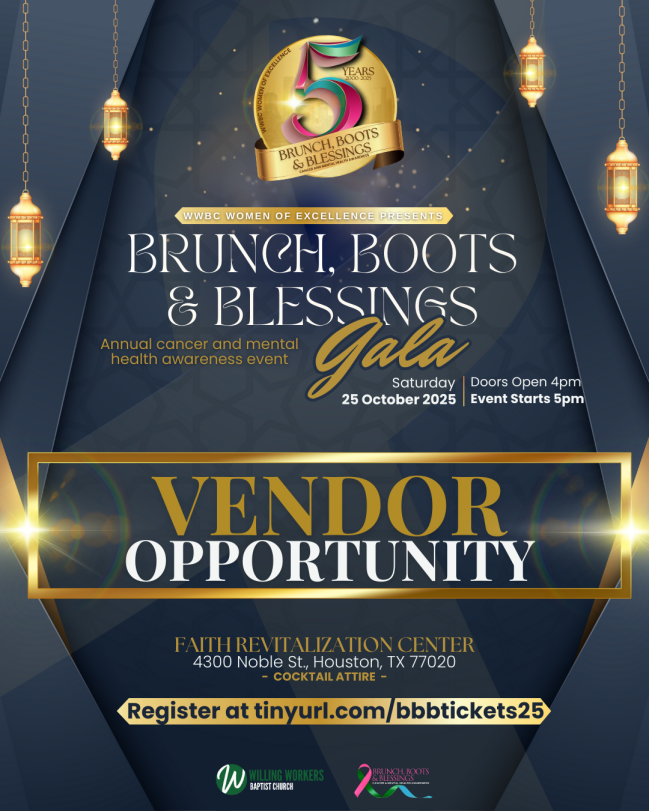 Please join us for our 5th Annual Brunch, Boots & Blessings Cancer & Mental Health Awareness Celebration. Mark your calendars for Saturday, October 25th. It will be held at Faith Revitalization Center 4300 Noble St. Houston,Tx. 77020. Doors open at 4pm.